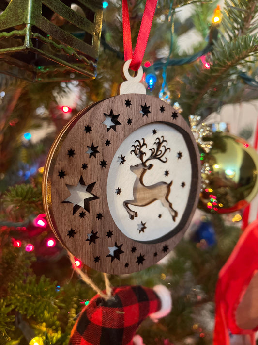 Reindeer Wooden 3D Ornament | Walnut and Maple | Laser Cut and Engraved