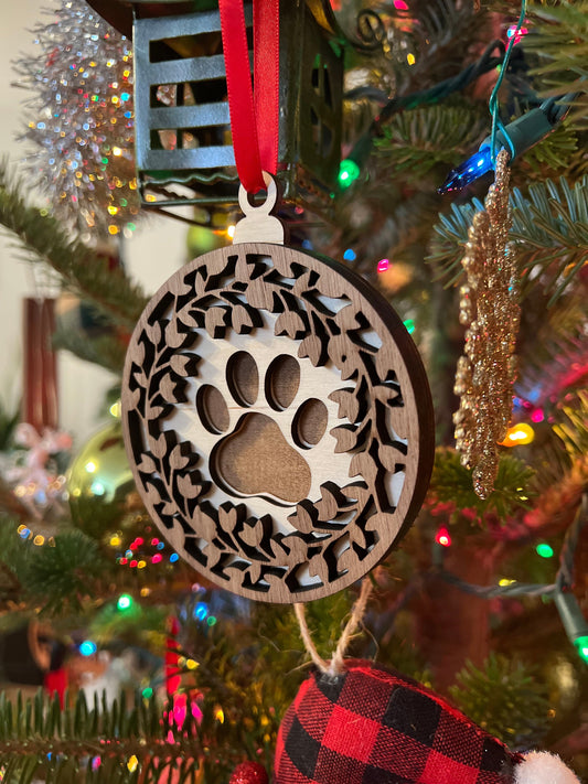 Paw Print Wooden 3D Ornament | Walnut and Maple | Laser Cut and Engraved