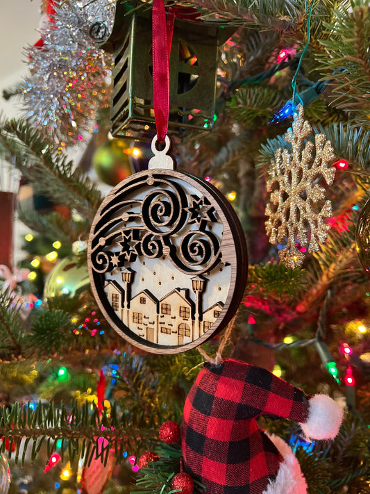 Snowy Town Wooden 3D Ornament | Walnut and Maple | Laser Cut and Engraved